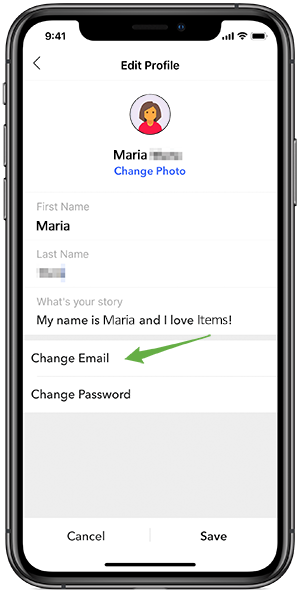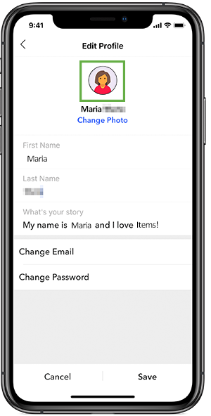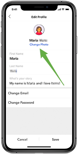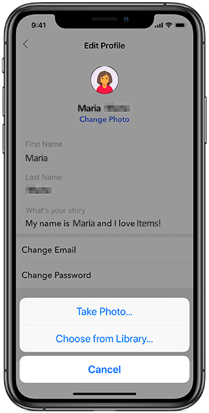 6) If you allow Items to access your photos, you will be brought to your camera and/or photo library. Choose a photo. After you take and/or choose a photo, your profile picture will update!
