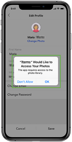 5) Decide if you want Items to access your camera and/or photos for your profile picture