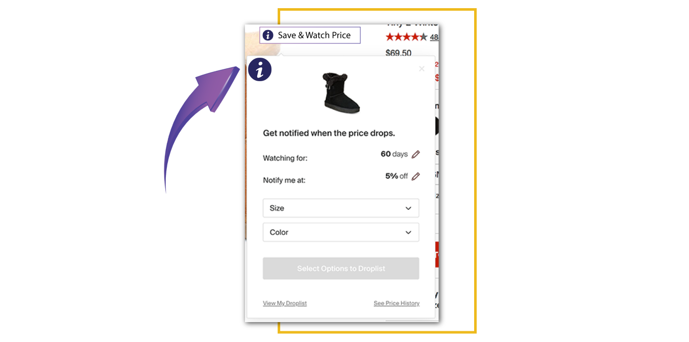 The Droplist feature monitors the price of products that you choose for 30, 60, 90, or 120 days. There is no limit to the amount of products you can Droplist! When the price drops to the price point that you have set, we will automatically send you an email. We will also remind you about the expiry date of a product in your Droplist so that you can continue to watch it if you choose.