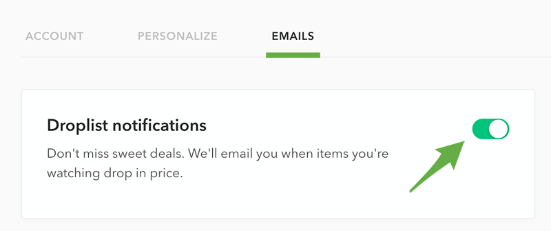 If the price of one of your products has dropped to the percentage that you have set, you’ll instantly receive an email. You can adjust your Droplist settings in your Account Settings page.